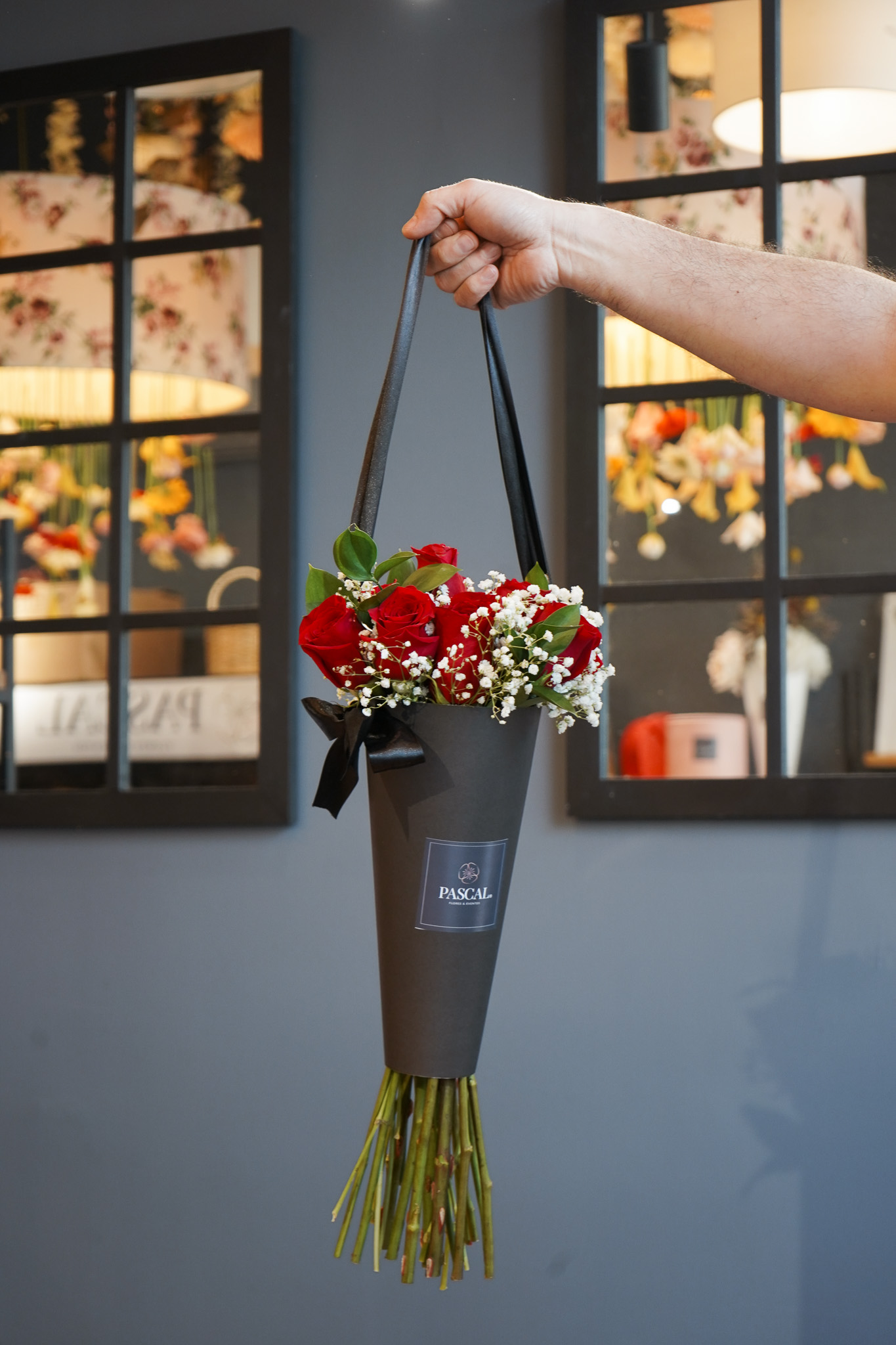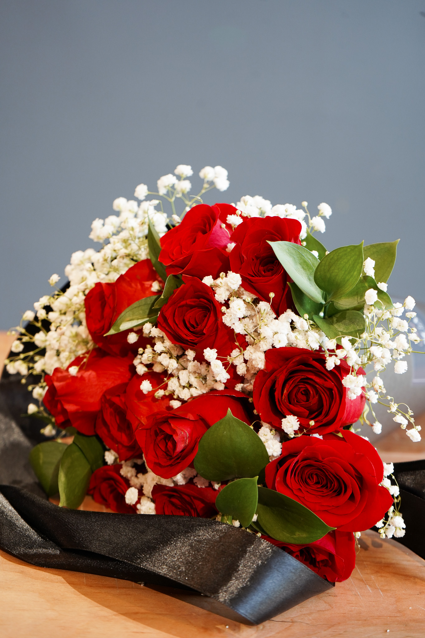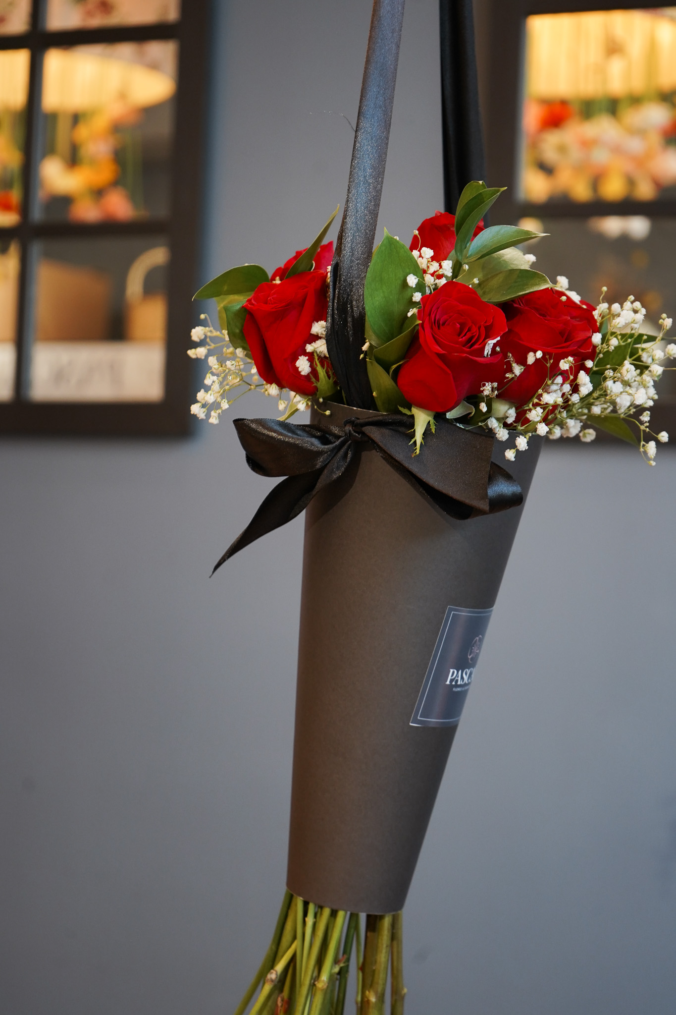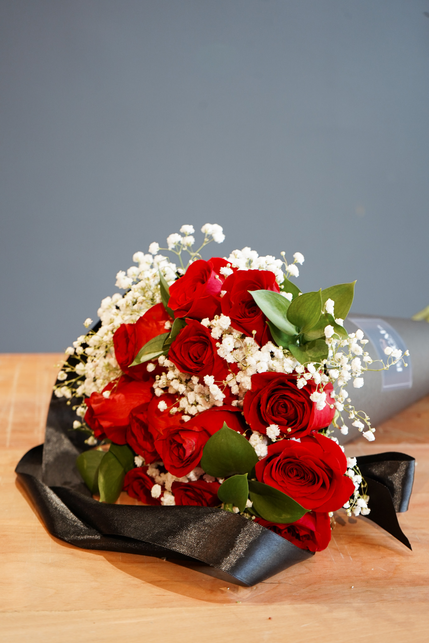 Hermoso cono negro con 12 rosas rojas de tallo largo ecuatorianas, mas Gypsofilia y ruscu.