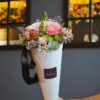 Cono floral fabricado a mano en cartulina doble fas, fácil de transportar y diseñado en papel reciclable, contiene 4 rosas ecuatorianas, 2 gerberas 10 varas de flores silvestres de temporada mas follajes. Lo puedes solicitar en otros tonos consulta disponibilidad de colores.